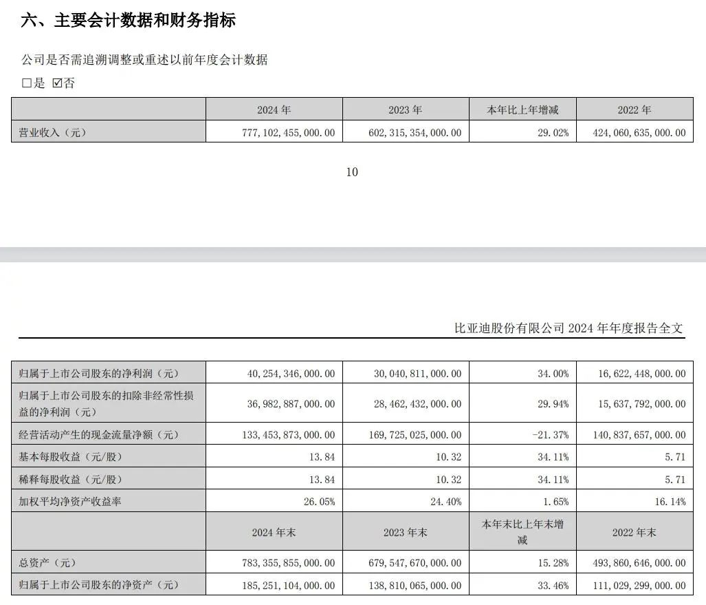 比亚迪(002594.SZ)24日晚间披露年报显示,2024年实现营业收入7771.02亿元,同比增长29.02%;归属于母公司所有者的净利润402.54亿元,同比增长34.0%;基本每股收益13.84元,同比增长34.11%。