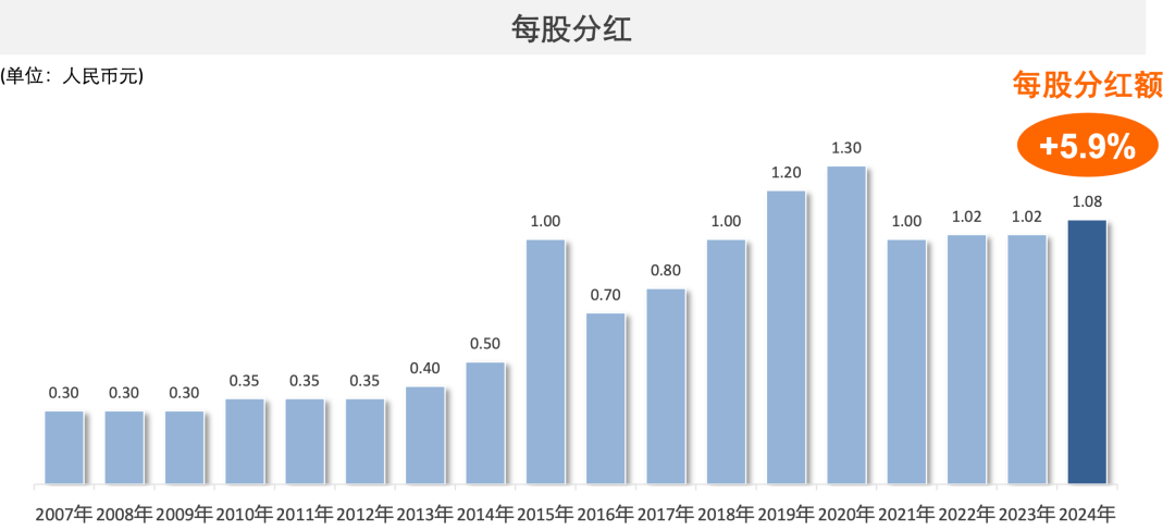 另据年报,在2024年业绩基础上,中国太保拟根据总股本96.2亿股,按每股1.08元(含税)进行年度现金股利分配,较上年度增长5.9%,共计分配约103.9亿元(含税)。这也是公司自2007年上市以来第三次分红超百亿元。