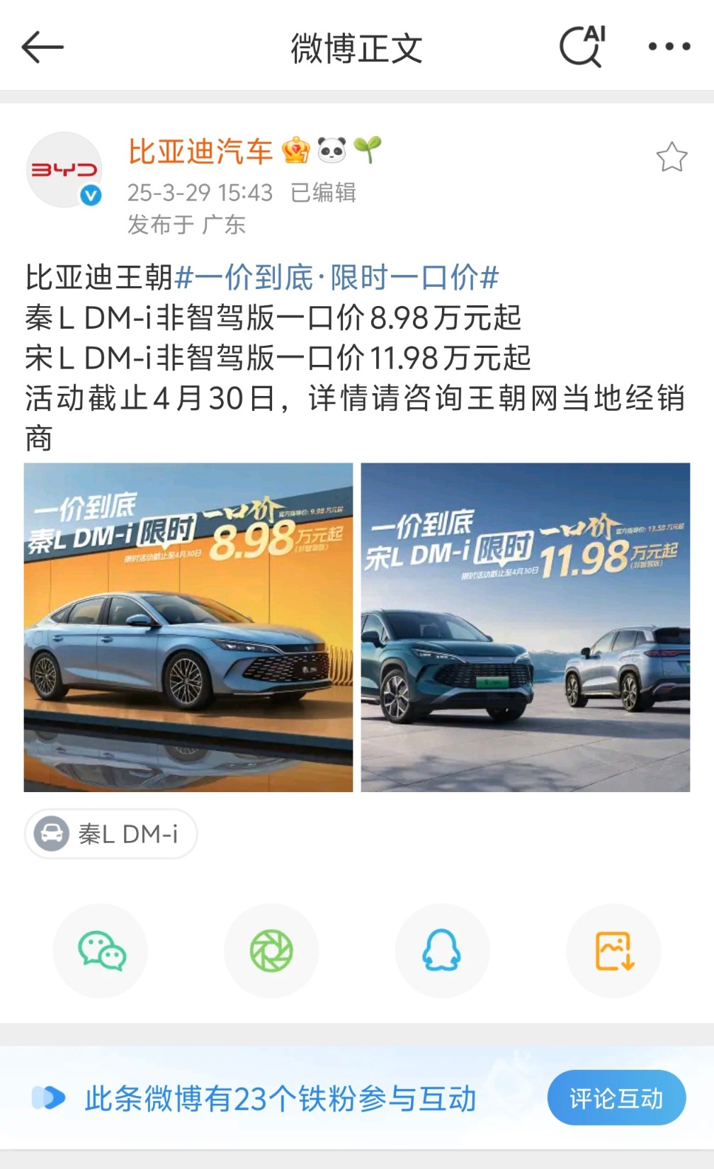 3月29日,比亚迪汽车官方微博发布消息称,对王朝网部分车型推出限时一口价。其中,秦L DM-i非智驾版起售价降1万元至8.98万元,宋L DM-i非智驾版起售价降1.6万元至11.98万元,活动截止日期为4月30日。