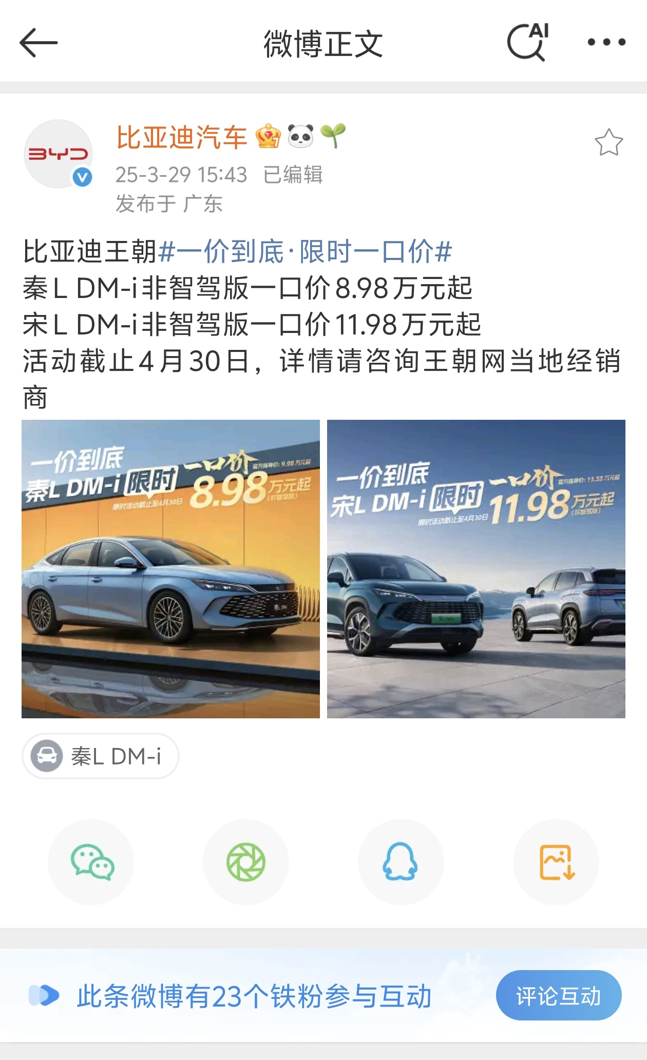 上证报中国证券网讯(记者 黎灵希)3月29日,比亚迪汽车官方微博发布消息称,对王朝网部分车型推出限时一口价。其中,秦L DM-i非智驾版起售价降1万元至8.98万元,宋L DM-i非智驾版起售价降1.6万元至11.98万元,活动截止日期为4月30日。