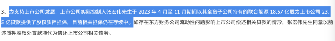 为支持上市公司发展,张宏伟于2023年4月至11月期间,以其全资子公司持有的联合能源集团有限公司18.57亿股为东方集团23.5亿元贷款提供了股权质押担保,目前相关担保仍在存续中。