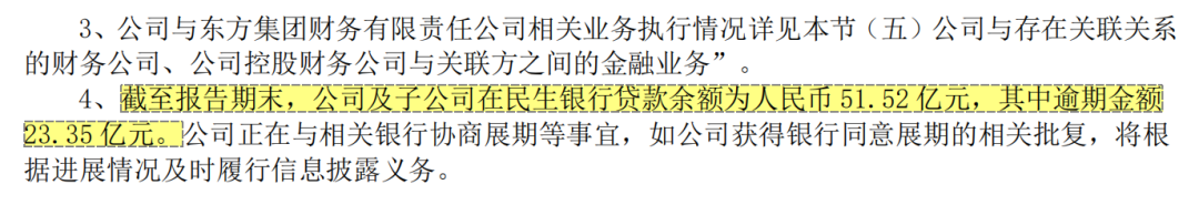 根据民生银行及东方集团财报显示,截至2024年年末,东方集团及其关联企业在民生银行及附属公司的贷款余额为76.94亿元。截至2024年上半年,东方集团及子公司在民生银行贷款余额为51.52亿元,其中逾期金额23.35亿元。