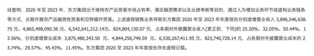 具体来看,上述虚假销售业务导致东方集团2020年至2023年年度报告分别虚增营业收入38.97亿元、48.65亿元、65.43亿元、8.25亿元,占各期对外披露营业收入(更正前,下同)的25.2%、32.05%、50.44%、13.56%,分别虚增营业成本38.75亿元、48.44亿元、65.3亿元、8.24亿元,占各期对外披露营业成本的23.74%、29.57%、45.43%、11.45%。