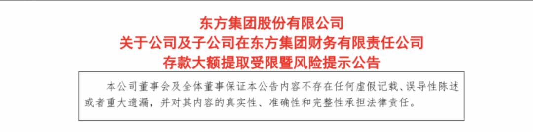 2024年6月18日晚间,东方集团发布公告称,公司及子公司在东方集团财务有限责任公司(简称“东方财务公司”)的16.4亿元存款出现大额提取受限情形。