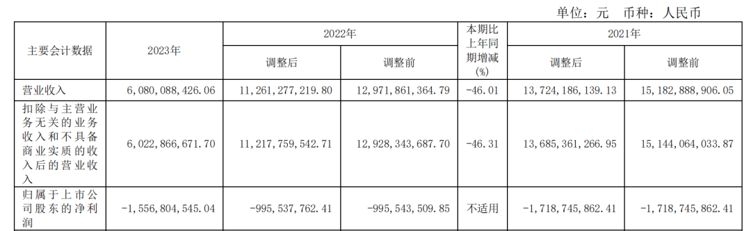 根据东方集团披露的公告,受房地产业务资产处置未达预期、未实现相关收入、房地产合作项目亏损等因素影响,公司已连续三个年度亏损。2021年至2023年,东方集团的营收分别为137.24亿元、112.61亿元、60.8亿元;归母净利润分别为-17.19亿元、-9.96亿元、-15.57亿元,累计亏损超42亿元。