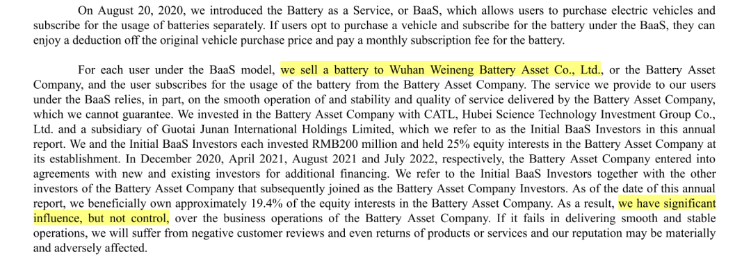 在BaaS模式下,蔚来向武汉蔚能出售动力电池并获利,武汉蔚能向用户提供电池租赁服务获利,并管理电池资产。虽然这种商业模式让蔚来和武汉蔚能智驾关系十分紧密,但根据蔚来年报的信息披露,蔚来并没有对武汉蔚能的实际控制权。