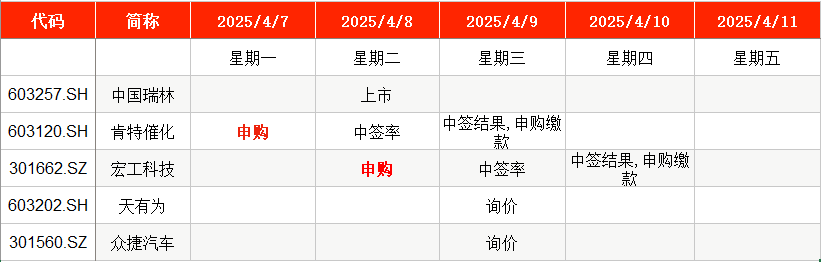 从时间表看,肯特催化在周一(4月7日)申购,宏工科技则在周二(4月8日)申购。
