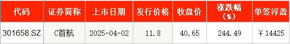 4月2日,首航新能在深圳证券交易所创业板正式挂牌上市,发行价为11.8元/股,截至上市首日收盘,该股报40.65元/股,涨幅为244.49%。以收盘价计算,投资者中一签浮盈为1.44万元。