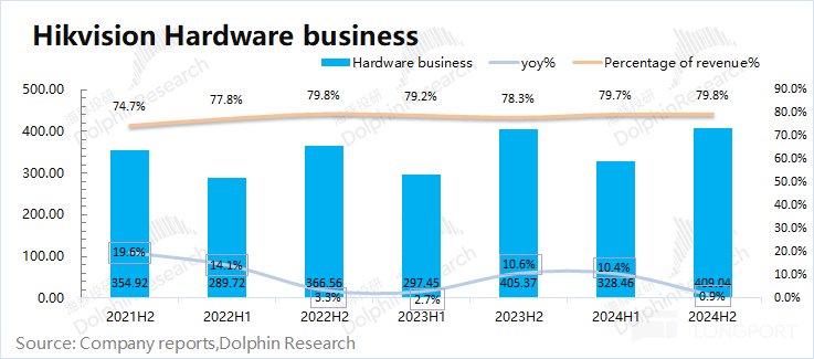 三、软硬一体化:软件波动大,硬件更稳健。从只卖监控的硬件厂商转型到具有软件赋能的安防龙头以来,公司一直保持着软硬一体化的经营模式。海豚君通过测算 2024 年下半年公司软件业务在收入占比回落至 20% 附近。相比于软件业务的下滑,硬件业务虽然增速回落,但仍保持着增长。