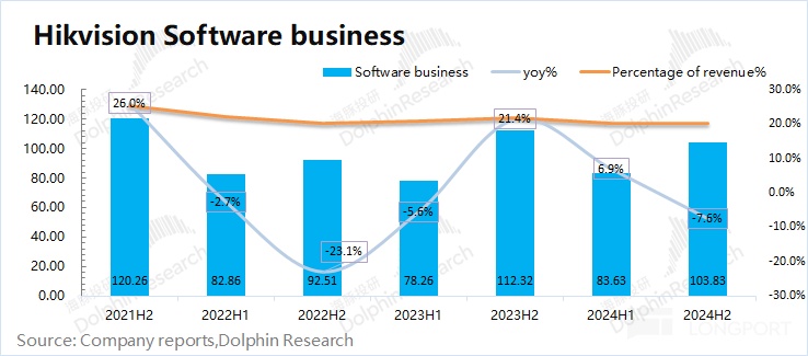 海豚君通过估算 2024 年下半年海康威视的软件端业务收入为 103.8 亿元,同比下滑 7.6%。海康威视软件附加值,在公司总收入的比重继续下滑至 20% 附近。