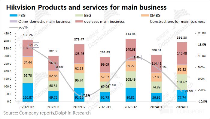 海康威视的主业产品及服务业务在 2024 年下半年实现营收 391.3 亿元,同比下滑 5.5%。受国内主业低迷的影响,再次陷入下滑。