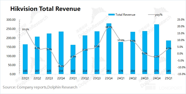 海康威视在 2025 年第一季度实现营收 185 亿元,同比上升 4%。公司本季度的营收增长,主要得益于创新业务和海外业务增长的带动,而国内业务仍然低迷。