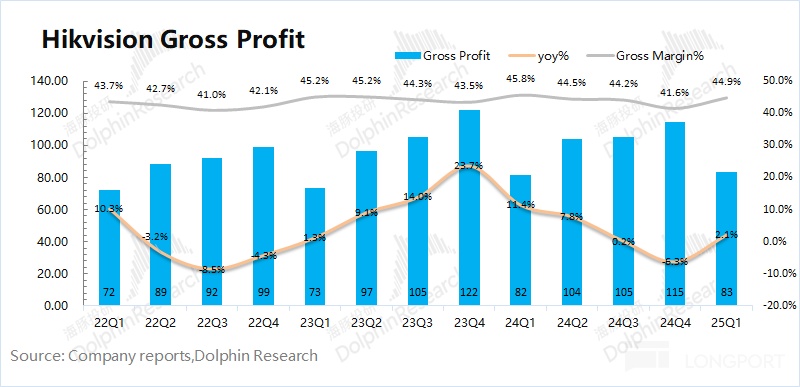 海康威视在 2025 年第一季度实现毛利 83 亿元,同比增长 2.1%。毛利增速低于收入端,主要是受毛利率回落的影响。