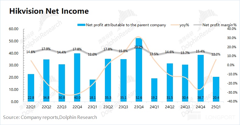 海康威视在 2025 年第一季度实现归母净利 20.4 亿元,同比增长 6.4%。其中公司本季度公司净利率也仅有 12%,仍旧在历史低位。