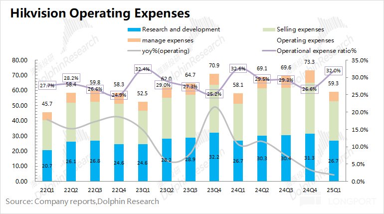 海康威视的核心费用情况主要有销售费用、管理费用和研发费用。海康威视 2025 年第一季度三项核心费用合计 59.3 亿元,同比增长 1.9%。三项核心费用率维持在 32%,同比下滑 0.6pct。