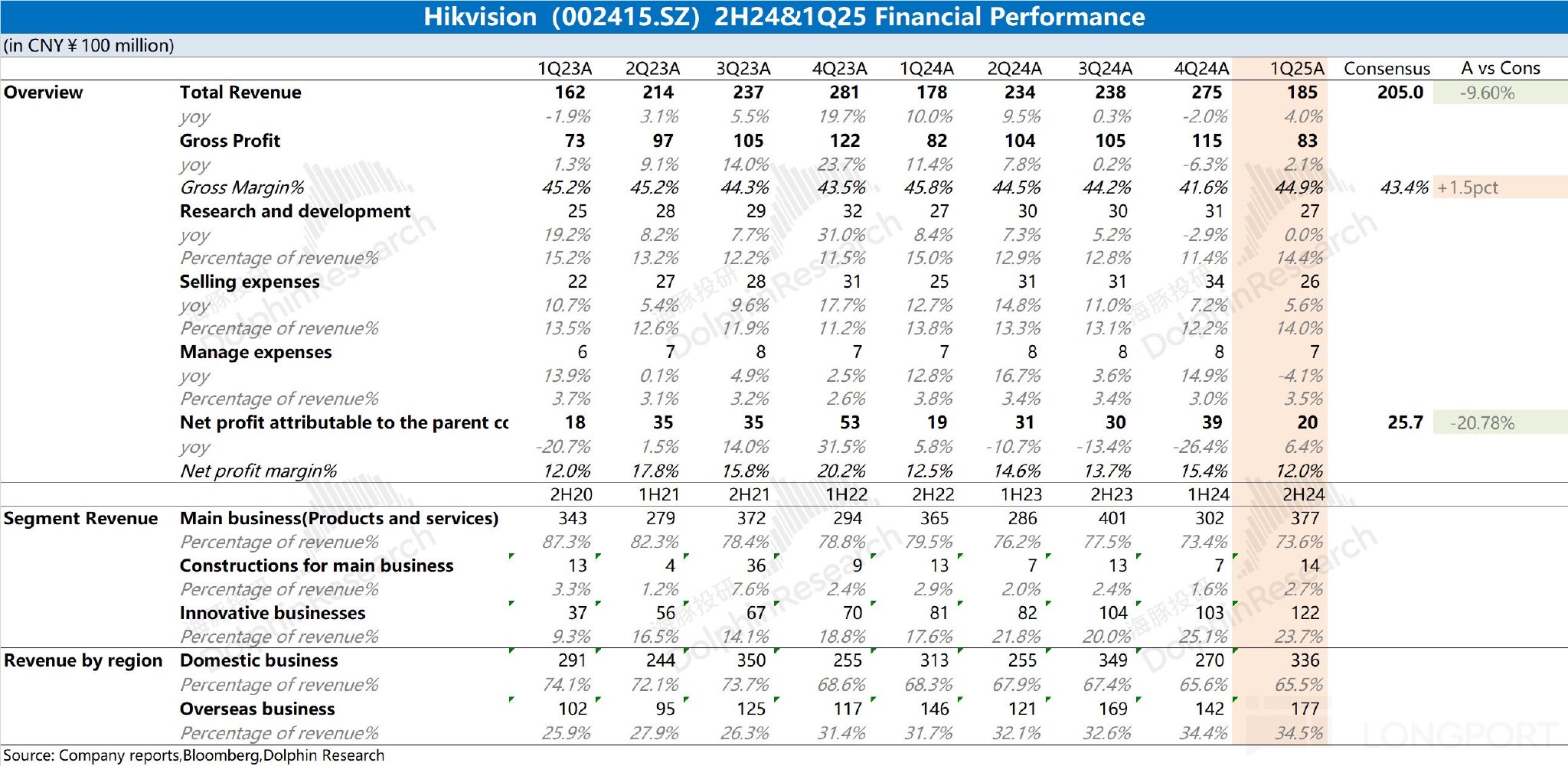 一、整体业绩:持续低迷。$海康威视(002415.SZ)在 2025 年第一季度实现营收 185 亿元,同比增长 4%。在国内主业低迷的情况下,收入增长主要来自于创新业务的带动;2025 年第一季度实现归母净利 20 亿元,同比增长 6.4%。虽然公司已经开始控费的操作,但利润端的回升仍主要受下游需求的影响,当前仍旧低迷。