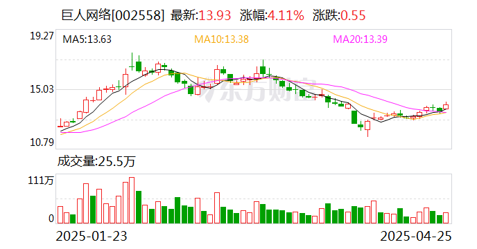 东吴证券04月25日发布研报称,给予巨人网络(002558.SZ)买入评级。评级理由主要包括:1)征途IP成功突破小程序渠道,合同负债同环比高增;2)多元新游蓄势待发,积极关注产品上线进展;3)打造游戏+AI生态,积极布局全产业链。风险提示:老游流水超预期下滑,新游表现不及预期,行业监管风险。