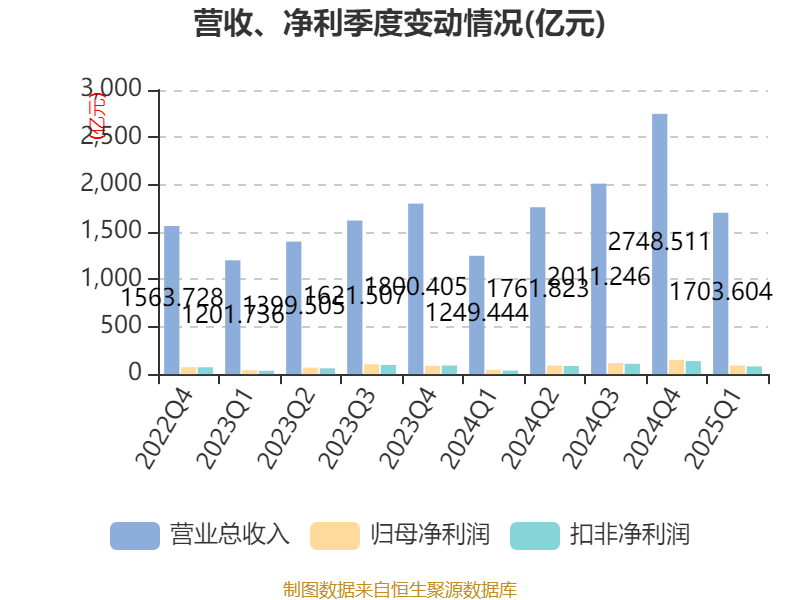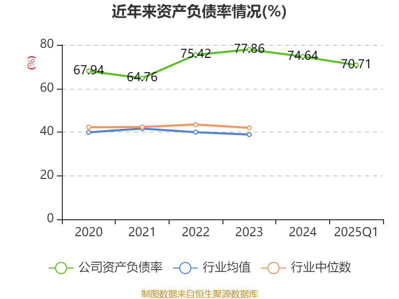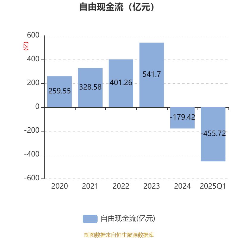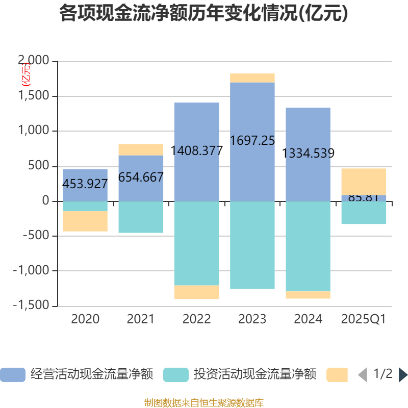 截至2025年一季度末,公司经营活动现金流净额为85.81亿元,同比下降16.1%;筹资活动现金流净额380亿元,同比增加431.84亿元;投资活动现金流净额-327.4亿元,上年同期为-272.7亿元。