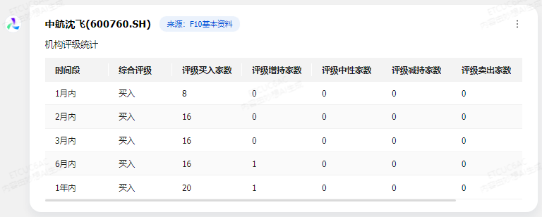 买入评级家数:在近1年内,有20家机构给予中航沈飞“买入”评级。
