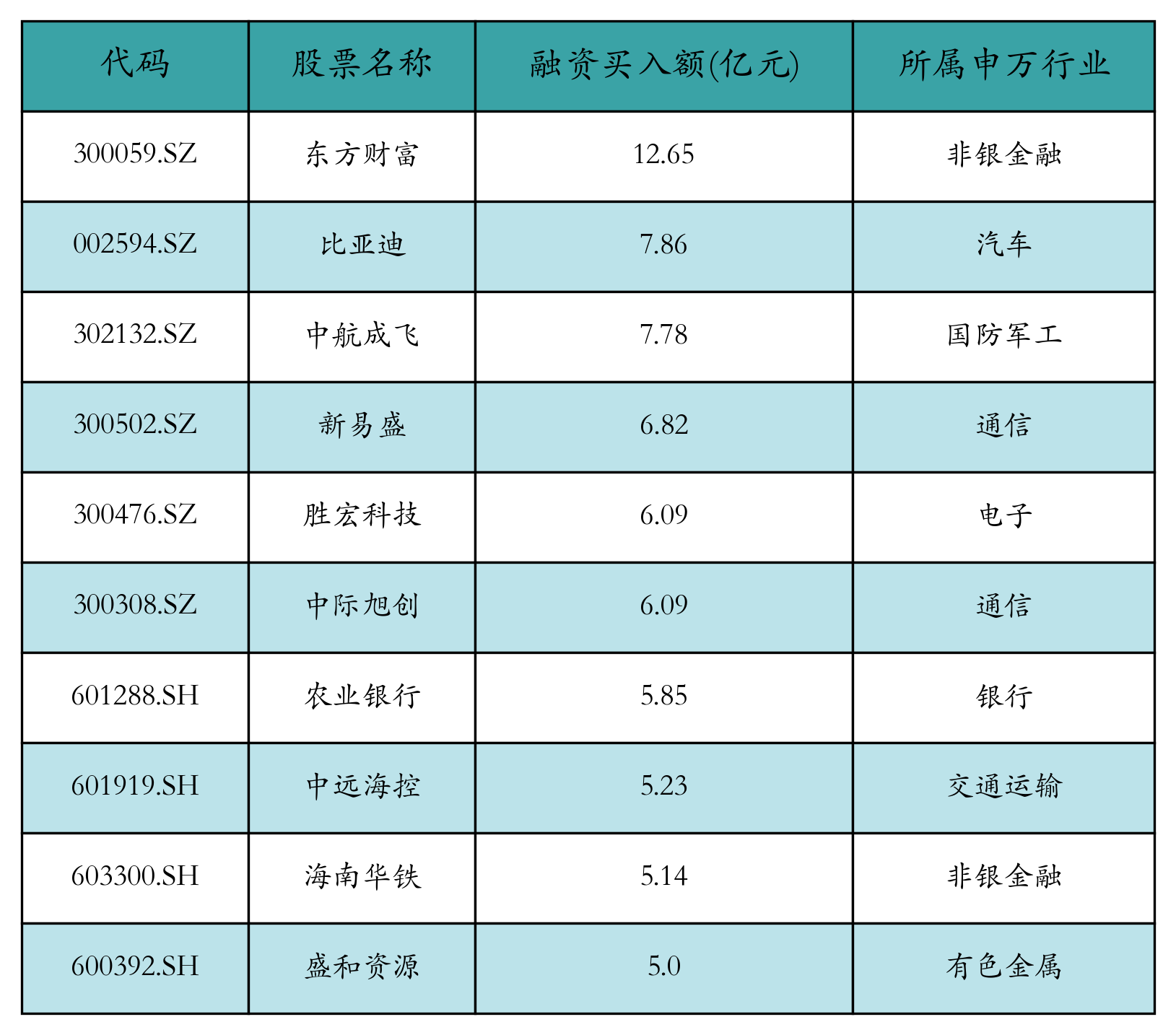两市共有3398只个股有融资资金买入,其中东方财富、比亚迪、中航成飞排名前三,买入金额分别12.65亿元、7.86亿元、7.78亿元。融资买入额前10个股详情见下表: