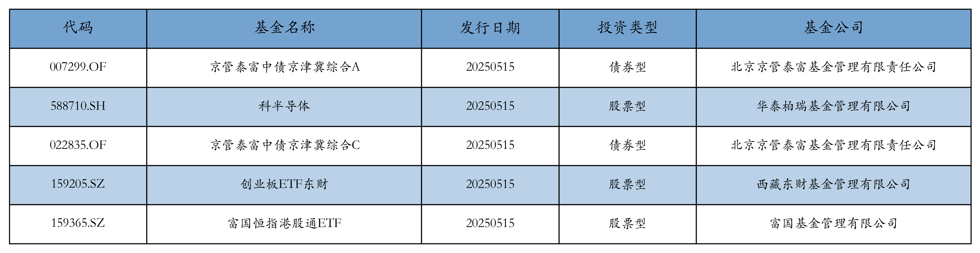昨日有5只新基金发行,分别为:京管泰富中债京津冀综合A、科半导体、京管泰富中债京津冀综合C、创业板ETF东财、富国恒指港股通ETF,详情见下表: