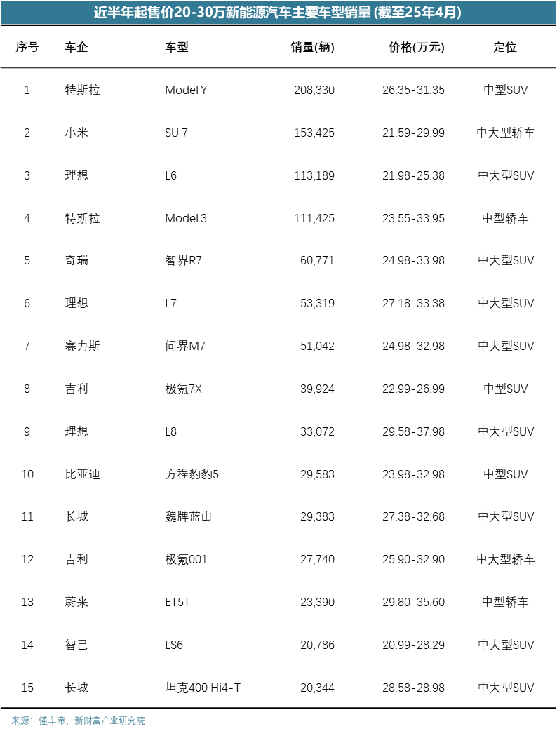 真正在20-30万跑出来的只有两家,小米和特斯拉,是这一价位独一档的存在。理想和问界就销量而言属于第二档,但更多的走的是和BBA一样的高端品牌下沉逻辑。