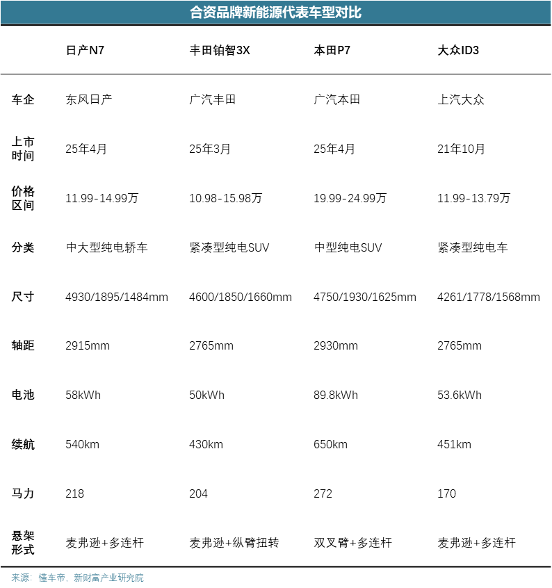 中外合资品牌主要包括日系三剑客(丰田、本田、日产)和德系的大众,各自出品的新能源代表车型包括丰田铂智3X、本田P7、日产N7和大众ID3,但它们的销量和关注度差别非常明显。