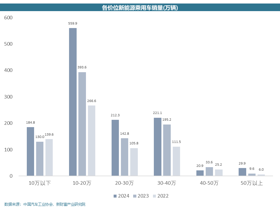 我们在过去的文章《越过电车的定价陷阱》中已经提及,过去三年20-30万的新能源汽车与30-40万的新能源汽车销量几乎相同,甚至在2023年还存在不小差距,并不符合我们传统认知中的金字塔型收入结构。