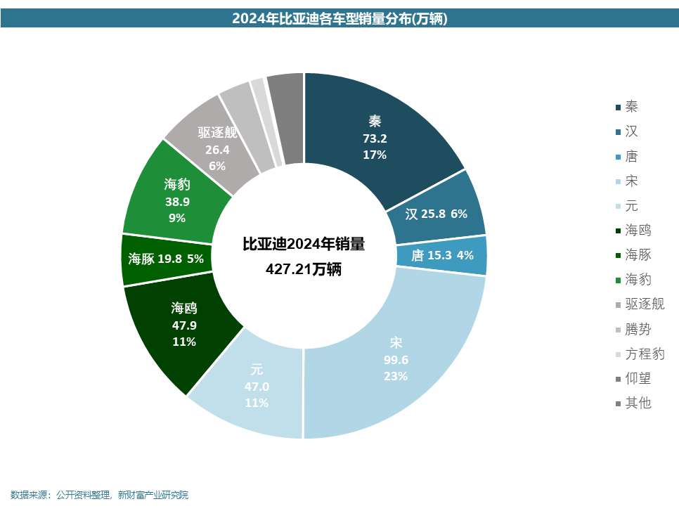 具体数据方面,2024年比亚迪全年销量达到了惊人的427.21万辆,其中秦家族(含秦PLUS、秦L)全年累计交付73.22万辆,宋家族(含宋PRO、宋L等)全年累计交付48.43万辆,元家族(含元UP、元PLUS)全年累计交付46.96万辆,海洋网的宋PLUS全年累计交付51.20万辆。