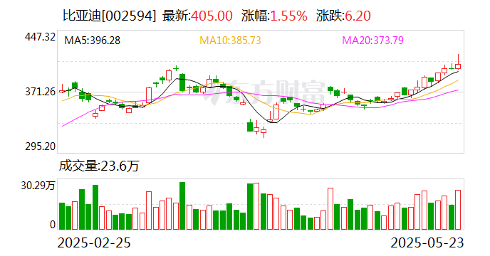 近日,比亚迪股价连续上涨。5月23日周五,比亚迪AH股盘中齐创历史新高,A股股价最高触及416.98元/股,H股股价最高触及477.8港元/股。但截至收盘均有所回落,A股股价收报405元/股,H股股价收报465.2港元/股。