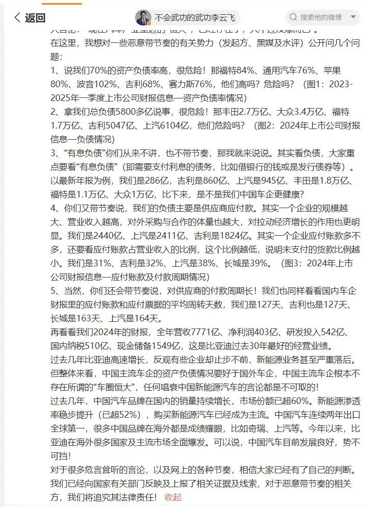 李云飞称,过去几年比亚迪高速增长,反观有些企业却止步不前,新能源业务甚至严重落后。但整体来看,中国主流车企的资产负债情况要好于国外车企,中国主流车企根本不存在所谓的“车圈恒大”,任何唱衰中国新能源汽车的言论都是不可取的!