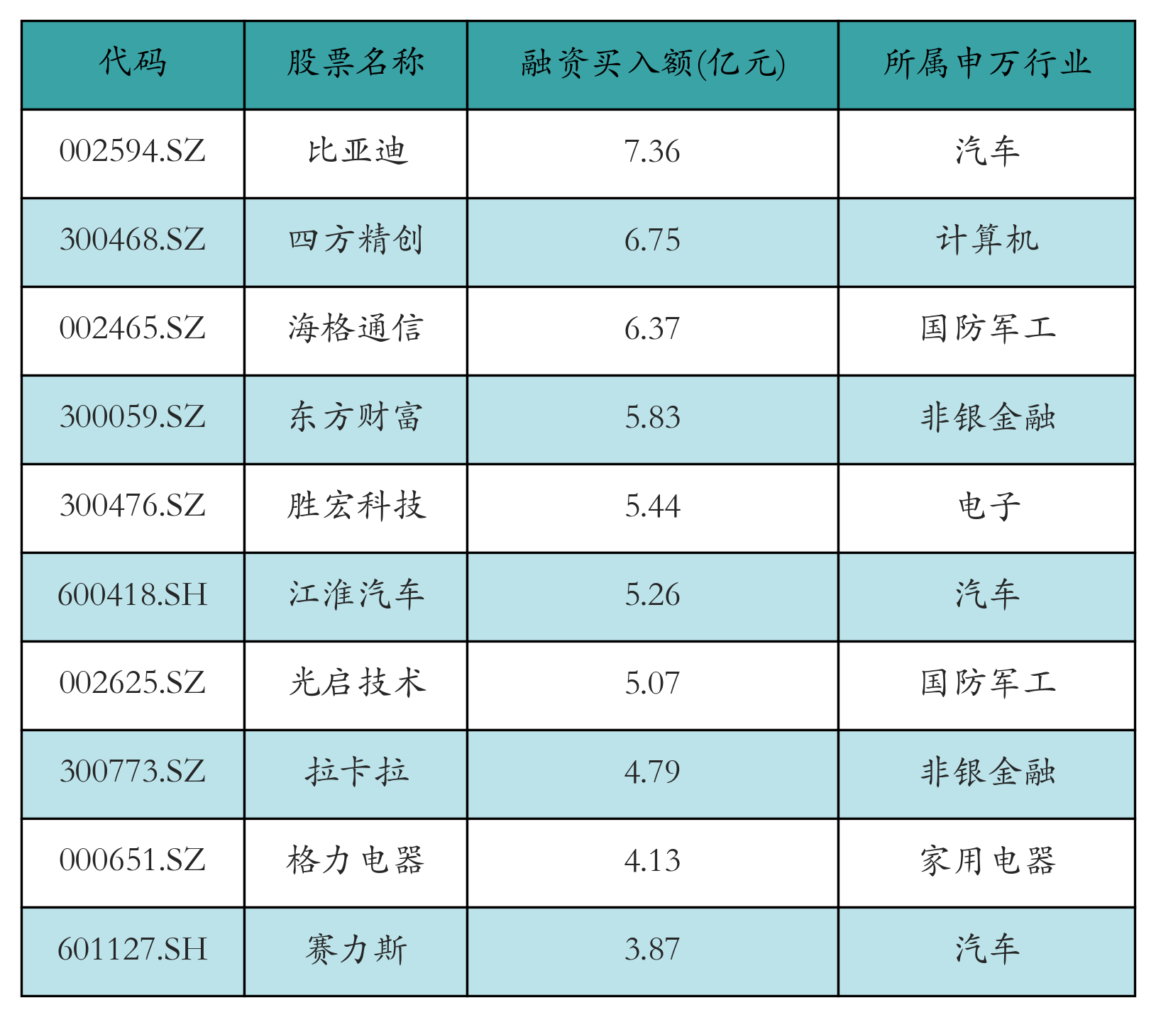 两市共有3401只个股有融资资金买入,其中比亚迪、四方精创、海格通信排名前三,买入金额分别7.36亿元、6.75亿元、6.37亿元。融资买入额前10个股详情见下表: