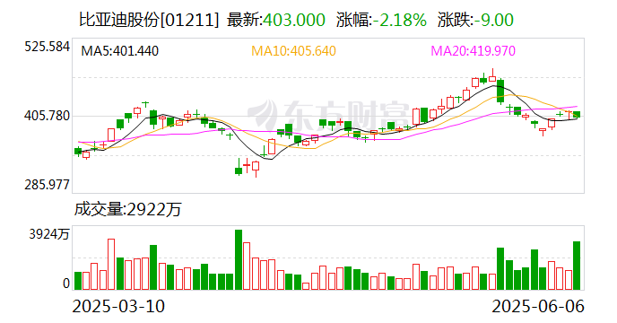 截至6月6日收盘,比亚迪A股报收于359.96元/股,最新市值为11052亿元。