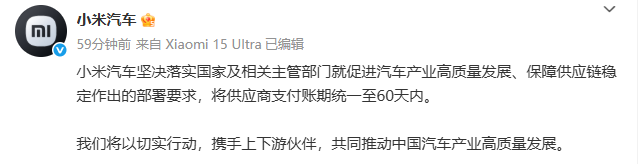 具体来看,小米汽车承诺坚决落实相关要求,将供应商支付账期统一至60天内;比亚迪汽车宣布,为落实国家及相关部门保障产业链供应链稳定、促进汽车产业高质量发展的系列部署,助力中小企业健康发展,同样将供应商支付账期统一至60天内;小鹏汽车也宣布,将支付账期统一至60天,以保障产业链供应链稳定,助力中小企业发展;零跑汽车则承诺,将一如既往坚持“60天付款”原则,以零拖欠为标准,精简审批流程,加强部门协同,确保付款流程高效畅通。