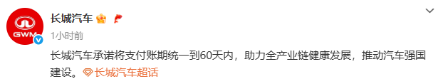 6月10日,广汽集团、中国一汽、东风汽车、赛力斯等车企率先作出承诺,表示将把供应商账期缩短至60天以内。6月10日至11日,小米、吉利、长安、比亚迪、奇瑞、小鹏、北汽、零跑、深蓝、长城等车企也相继发表声明,承诺“支付账期不超过60天”。多家车企同一时间段内在供应商账期问题上达成一致,引发广泛关注。