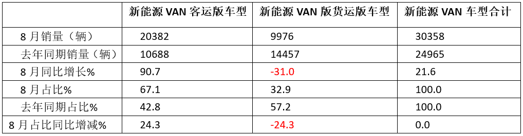 表2,根据终端上牌数据,按车型用途划分,2025年8月国内各类新能源VAN车型销量同比、占比及占比同比变化统计:
