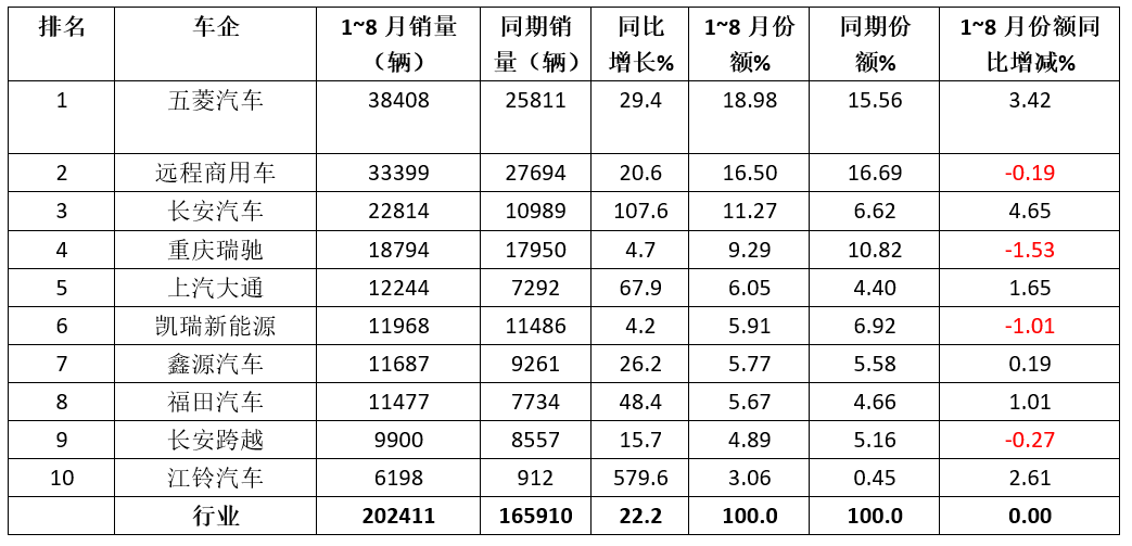 五菱汽车是唯一销量近4万辆的车企,强势夺冠,同比增长29.4%,跑赢大盘,市场占比18.98%;且占比同比增加3.42个百分点,是占比同比增加第二多的车企;可见其冠军地位增强。