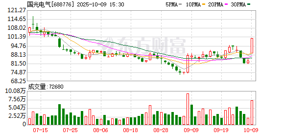 10月9日国光电气(688776)收盘价100.20元,收盘涨停,全天换手率6.71%,振幅12.84%,成交额7.02亿元。科创板交易公开信息显示,当日该股因日收盘价涨幅达15%等上榜。