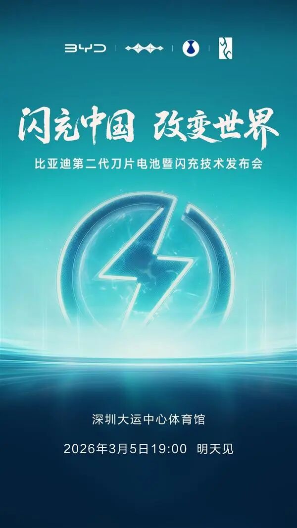 今日,比亚迪汽车正式官宣,第二代刀片电池暨闪充技术发布会定档3月5日19:00,将在深圳大运中心体育馆盛大举行。这场备受行业瞩目的技术发布会,不仅承载着比亚迪电池技术的迭代升级,更被市场解读为其引领新能源汽车行业变革的又一重要举措,消息一经发布便引发全网广泛关注。
