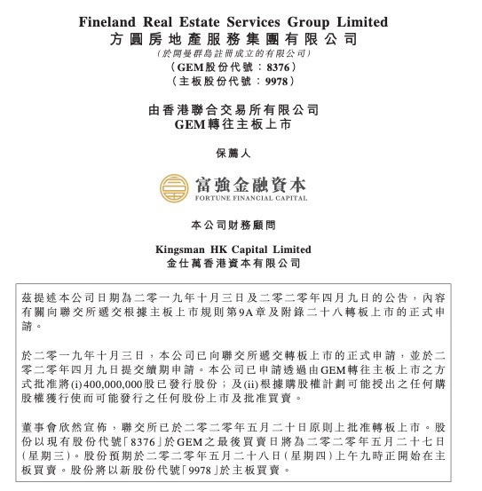 据了解,圆房地产服务是于2019年十月三日,向港交所递交转板上市的正式申请,并于2020年4月9日递交续期申请。据此,方圆房服申请透过由GEM转往主板上市的方式批准将4亿股已发行股份,及未来根据购股权计划可能授出的任何购股权获行使而可能发行的任何股份转板上市。目前,上述申请已获港交所原则上批准。方圆房服股份预期于2020年5月28日上午九时正开始在主板买卖,并使用新股份代号“9978”。关于转板上市的理由方圆房地产服务集团表示,公司自2017年11月15日起在GEM上市。本集团为中国物业中介服务提供商,主要于广州及?湾区其他地区透过三个主要业务分部提供服务,即(i)房地产代理服务(包括网上转介平台服务);(ii)物业研究及谘询服务;及(iii)综合服务。有关本集团主要业务的进一步详情载于本公告“本集团业务概要”一节内。紧随于2018年2月对主板上市规则及GEM上市规则作出修订后,联交所将主板定位为“优质板块”及将GEM重新定位为独立板块。于主板上市的公司被投资者视为较GEM上市的公司具有更优越地位,而董事预期主板将继续加强市场信心及吸引不同投资者的资金。董事认为,GEM上市令本公司获得公众认可及知名度提升。自于GEM上市以来,本公司已扩大客户群并于开展项目数量、收益及盈利上取得增长。例如,本集团向其提供一手房地产代理服务(包括网上转介平台服务)之独立客户的项?数目由2017年之186名增至2019年之205名。据董事于作出审慎查询后所深知及确信,该等客户部分基于本集团作为一间香港上市公司之声誉而接触本集团。董事会认为,转板上市将有助增强本公司之企业管治及可靠度,因而将进一步向公众投资者推广本公司的企业形象及认知度,从而扩大投资者基础及提高股份的买卖流通量。此外,转板上市亦将让本集团得以巩固其行业地位,并提升其保留及吸引专业人才及客户的竞争实力。因此,董事认为,转板上市将对本集团的未来增长、财务灵活性及业务发展有利,并为股东创造长远价值。转板上市将不会涉及本公司发行任何新股份。于本公告日期,董事会预期,转板上市后本集团业务活动性质不会有任何重大变动。资料显示,方圆房服集团2019年总收益为约人民币2.56亿元,较2018年的人民币2.29亿元增加约12%。就一手市场房地产代理服务方面,截至2019年末,方圆房服为229个项目提供代理服务。截至2020年3月31日止三个月,本公司拥有人应占溢利约为人民币330万元(截至2019年3月31日止三个月:约人民币460万元)。