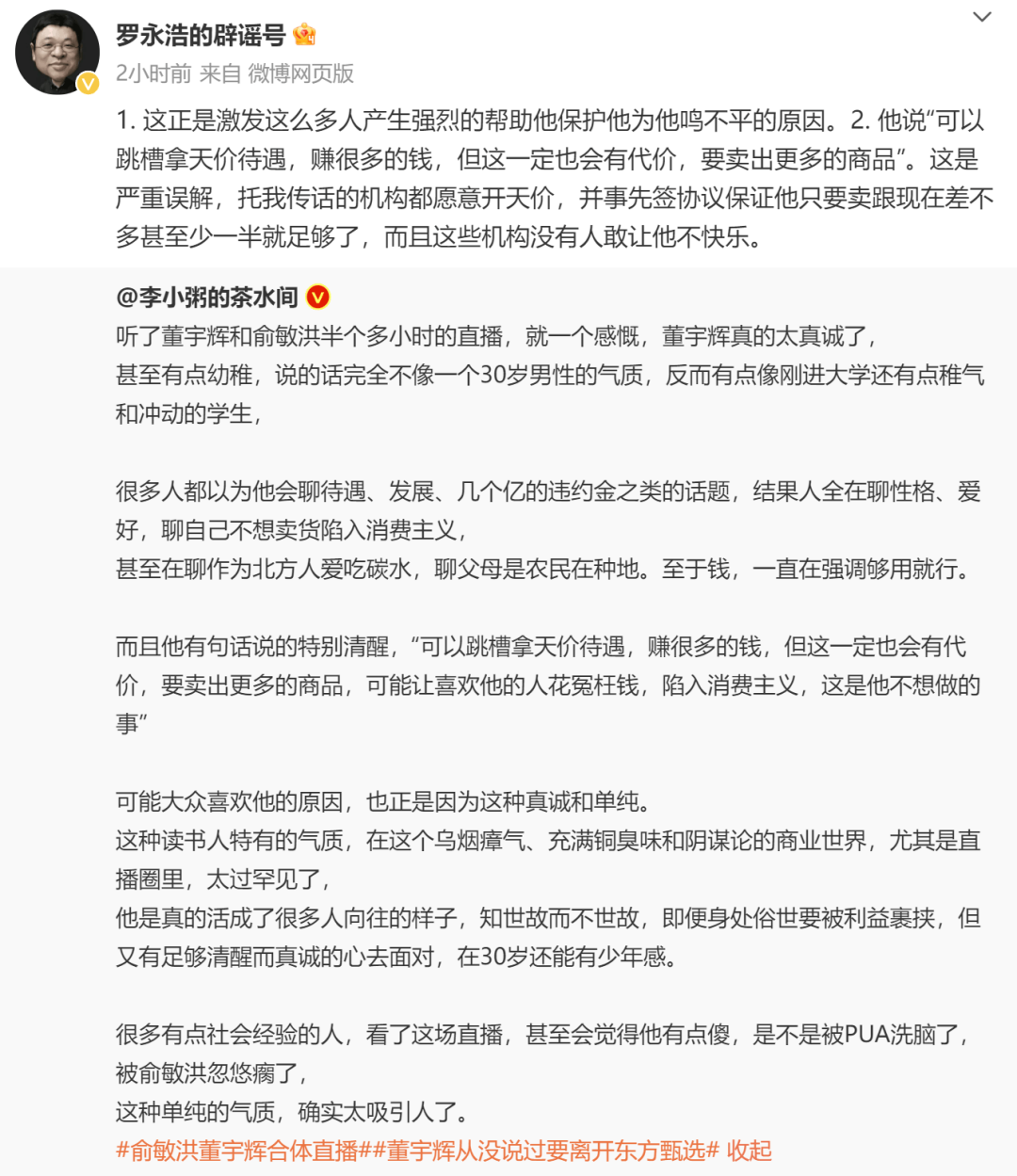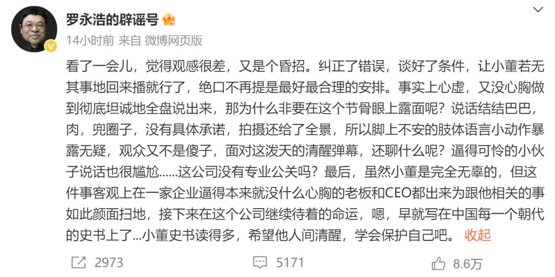 12月16日晚间,在俞敏洪与董宇辉的合体直播尚未结束之时,罗永浩就已在微博吐槽:“观感很差,又是个昏招”,并且表示“小董史书读得多,希望他人间清醒,学会保护自己吧”。