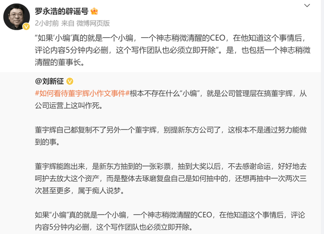 针对昨日多位网友质疑的引发此次“小作文争议”的“小编”为何没有处罚,罗永浩也转发了一位网友评论:如果“小编”真的就是一个小编,一个神志稍微清醒的CEO,在他知道这个事情后,评论内容5分钟内必删,这个写作团队也必须立即开除。