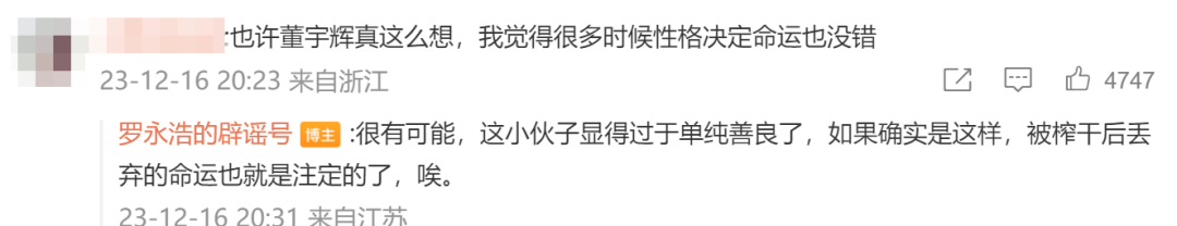 有粉丝表示, “也许董宇辉真这么想,我觉得很多时候性格决定命运也没错。”罗永浩回应称:“这小伙子显得过于单纯善良了,如果确实是这样,被榨干后丢弃的命运也就是注定的了。”