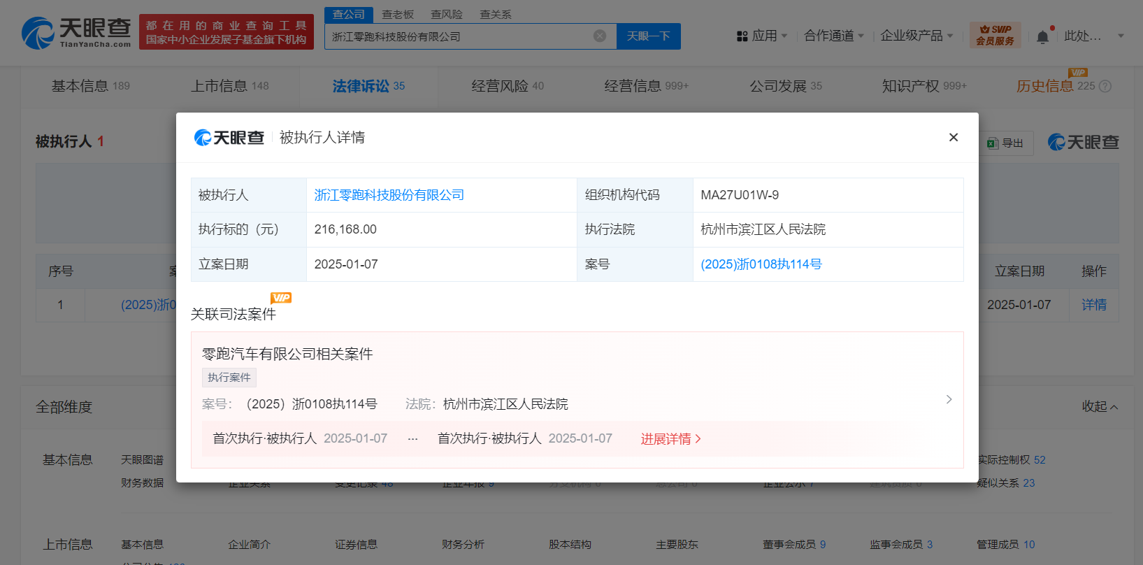 天眼查深度风险信息显示,近日,浙江零跑科技股份有限公司、零跑汽车有限公司新增一条被执行人信息,执行标的21.6万余元,执行法院为杭州市滨江区人民法院。