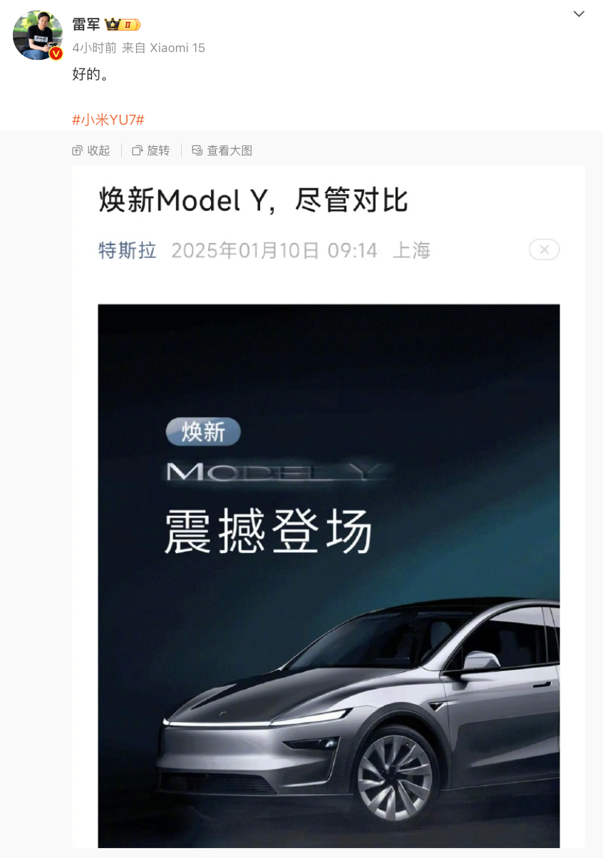 【导读】特斯拉上线新款Model Y称“尽管对比”,雷军回应
