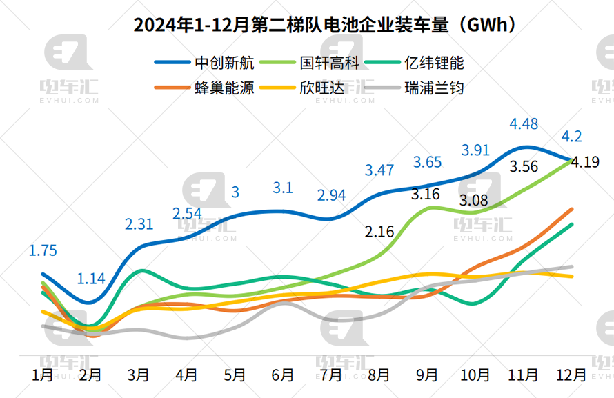 中创新航、国轩高科、亿纬锂能等企业则在不同月份出现了不同程度的波动,值得关注的是,国轩高科在7月份之后装车量增速明显加快,与中创新航的差距越来越小;蜂巢能源处于稳步增长状态,而亿纬锂能在2014年10月份之后装车量才出现明显增长态势,欣旺达表现较为稳定,瑞浦兰钧在12月装车量超越欣旺达。