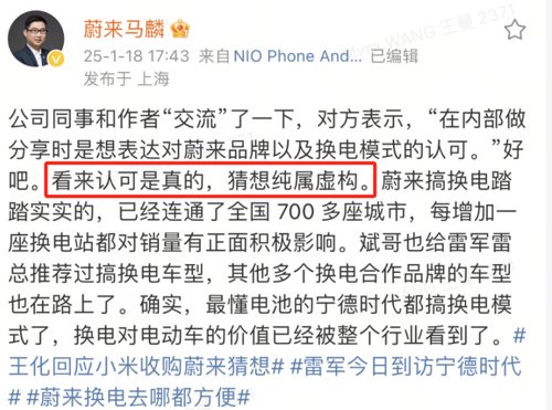 中国基金报记者 邱德坤1月18日,蔚来公司品牌传播与营销负责人马麟发布微博,回应“小米收购蔚来”的猜想纯属虚构。同一天,小米集团公关部总经理王化针对上述猜想,也发布微博予以间接否认。近日,海通国际一份研报提出2025年的五大猜想。其中猜想之一是小米将收购蔚来,蔚来换电业务的使用范围得以扩大,甚至在专利保护下开放给其他车企。随即,“小米收购蔚来”的猜想,在汽车行业引发热议。蔚来回应“猜想纯属虚构”已与海通国际相关人员“交流”马麟发布微博称,蔚来公司工作人员已与海通国际作出相关猜想人员进行了“交流”。马麟转述海通国际相关人员回复称,海通国际相关人员在内部分享“小米收购蔚来”的猜想,是想表达对蔚来品牌以及换电模式的认可。“看来认可是真的,猜想纯属虚构。”马麟表示。