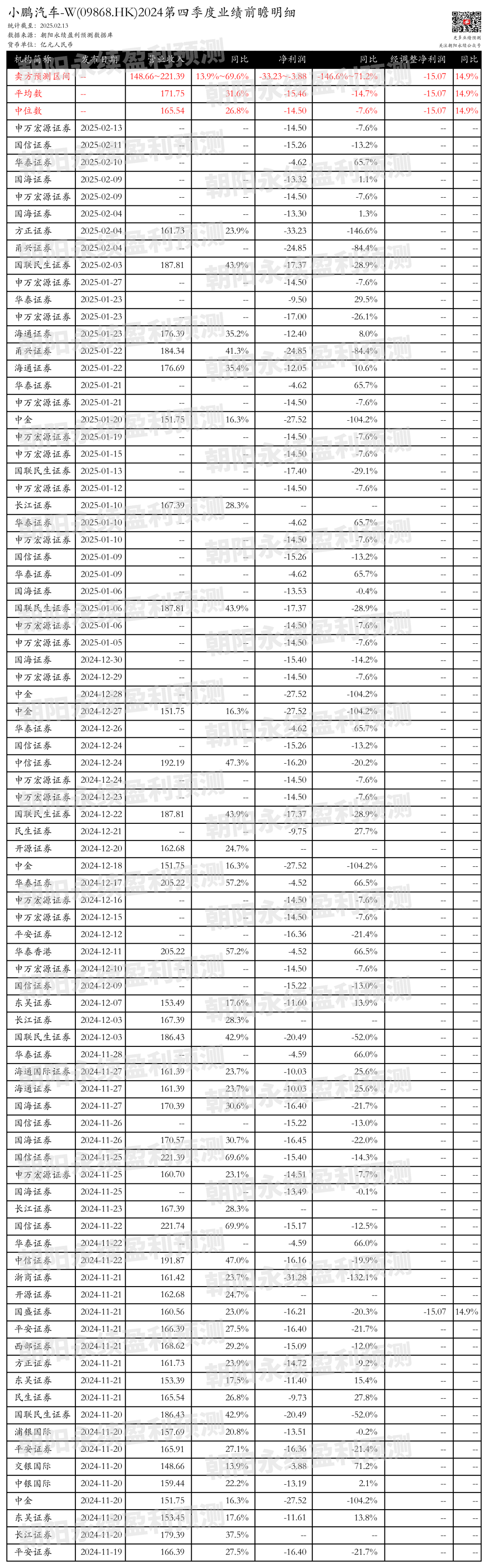 截至2025年02月13日,根据朝阳永续季度业绩前瞻数据: