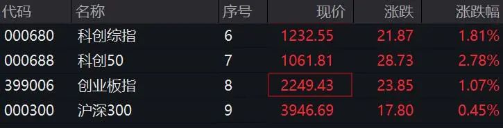 截至发稿,沪指翻红,深证成指涨0.83%,创业板指涨逾1%。科创50指数大涨近2.8%。