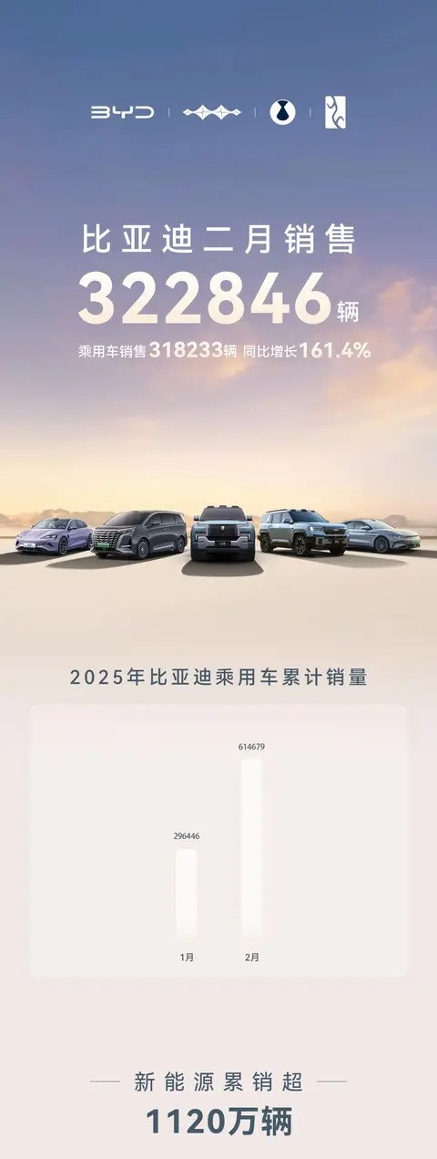 近日,比亚迪公布了2月份的销售数据,销量达到322846台,同比增长161.4%。这一成绩几乎相当于某些头部新势力品牌全年的销量总和。尽管这些新势力品牌在市场中声量不小,但从规模上看,与比亚迪相比仍存在明显差距。即便2月包含春节假期,比亚迪的表现依然稳健。
